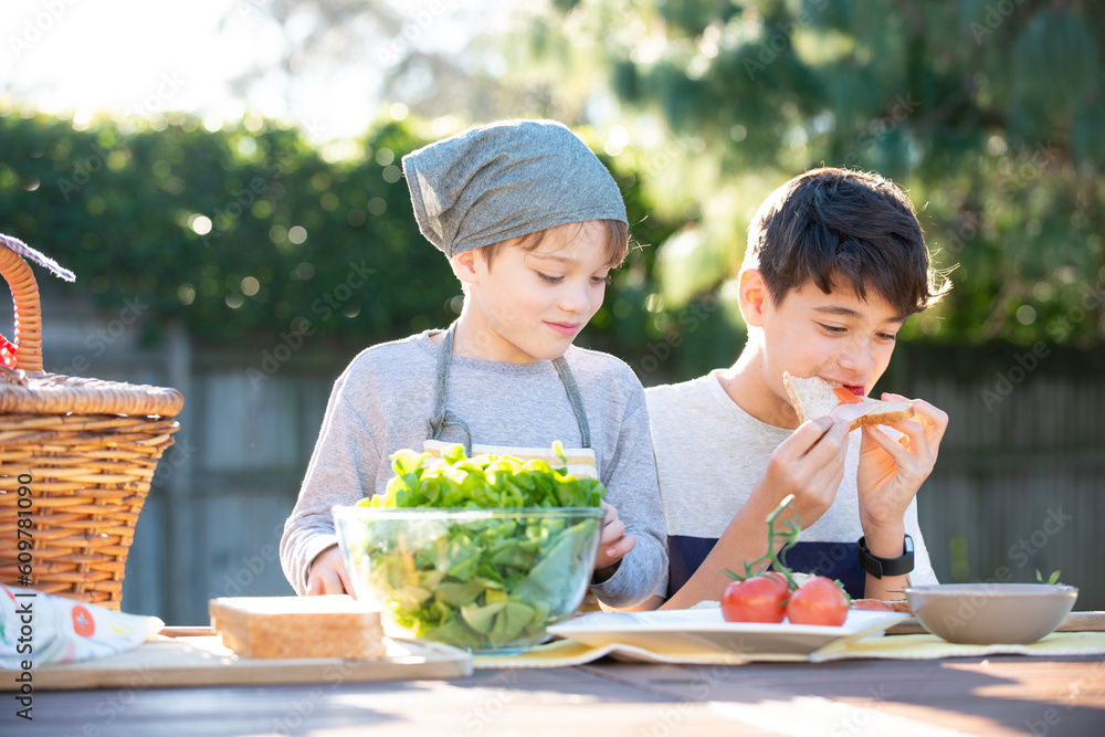 Kids preparing sandwiches and fresh veggies outside on a sunny day.