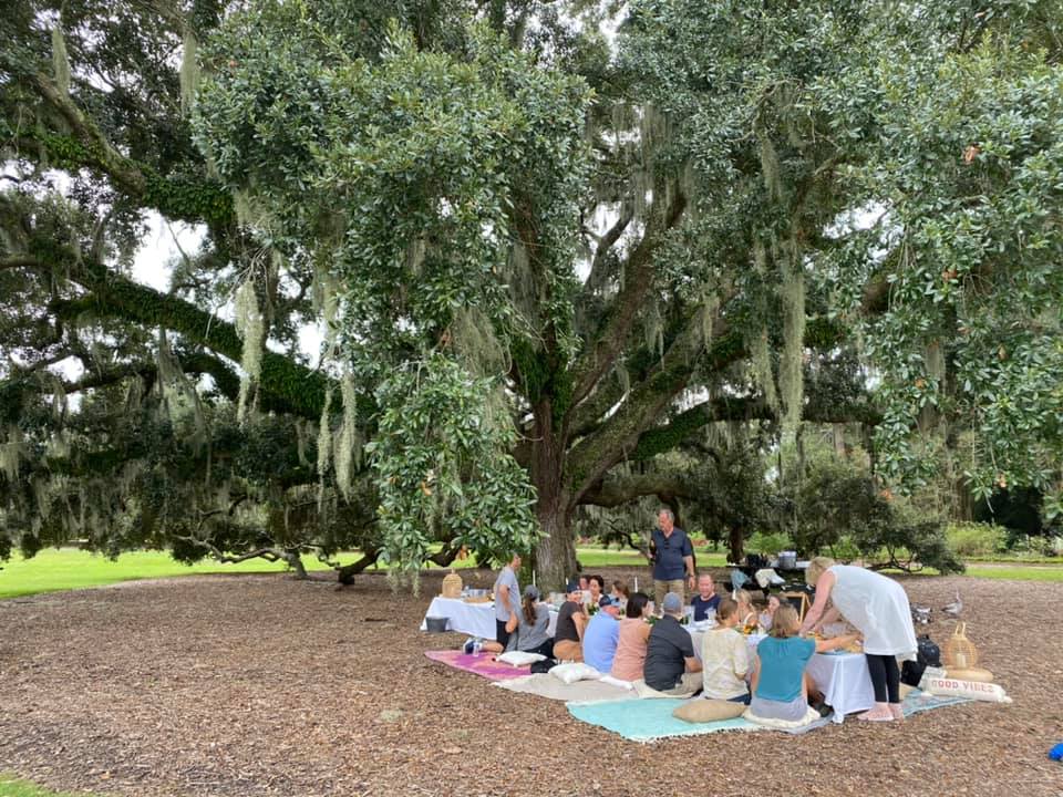 Group gathering under a large oak tree enjoying food and conversation—an inspiring way to pack the perfect picnic in Charleston’s parks.